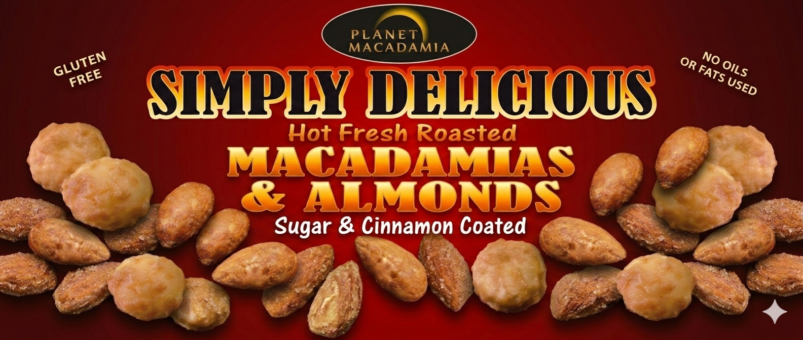 Macadamia and almonds roasted and coated in sugar and cinnamon. A variety of other flavours are also available. Locally grown on the Sunshine Coast.