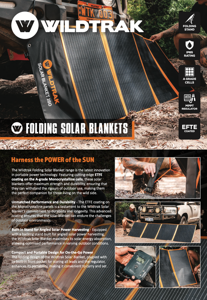 The Wildtrak Folding Solar Blanket rnge is the latest innovation in portable power technology. Featuring cutting-edge ETFE coating on A-grade Monocrystalline cells, these solar blankets offer maximum strength and durability, ensuring that they can withstand the rigours of outdoor use.